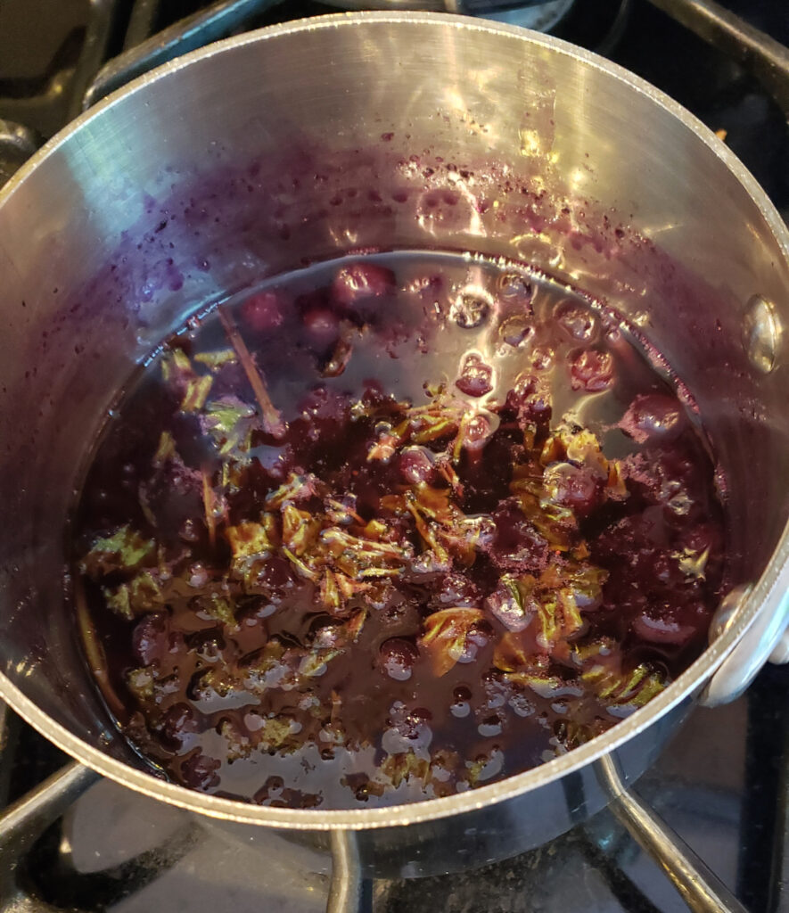 - In a small saucepan, lightly smash the blueberries with a fork to break them up. Add the water, sugar, basil, mint and salt and bring to a boil.