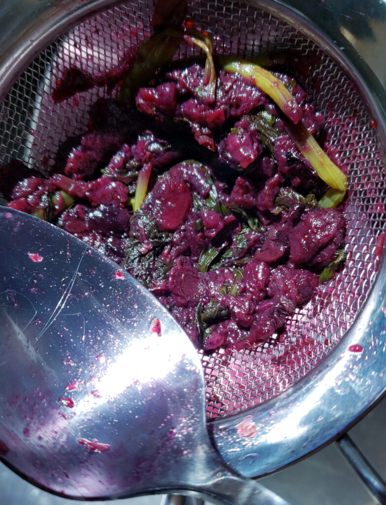 - Stir constantly while the syrup is boiling. When the berries have mostly broken down and the sugar has dissolved – approximately 10 minutes. Remove from heat and pour the syrup through a strainer, gently pressing as much liquid as possible out of the fruit. You should have anywhere from 1 cup to 1 1/3 cups of syrup.