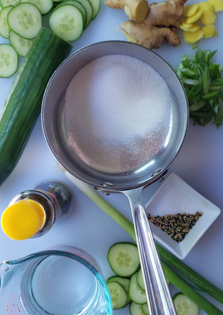 A beautiful jar of Easy 10-Minute Ginger Sesame Pickles sits pretty in the center of a cutting board - surrounded by fresh cucumbers, scallions and ginger.