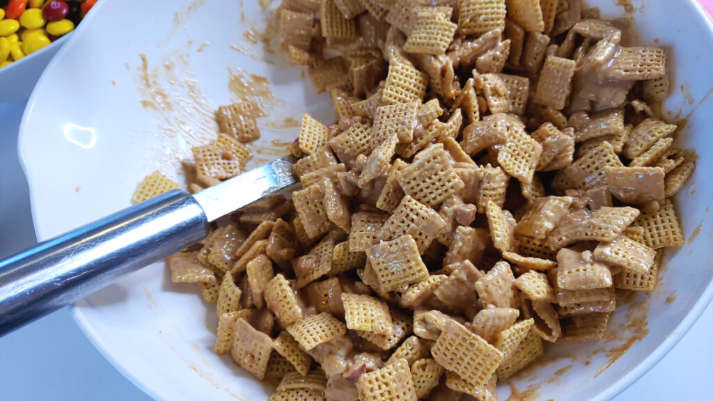 So, how did we manage to get the sugar down so much? I will tell you. Once the cereal is coated in the chocolate and peanut butter mixture, it’s important to allow it to cool and harden for 15 minutes. The powdered sugar does serve a purpose. It helps keep everything from sticking together in one big glob. However, by allowing the coating to firm up on its own first, we are able to reduce the amount of powdered sugar needed to prevent sticking considerably. This recipe isn’t as snow white as some versions, but I rather like the fall colors of this mix.