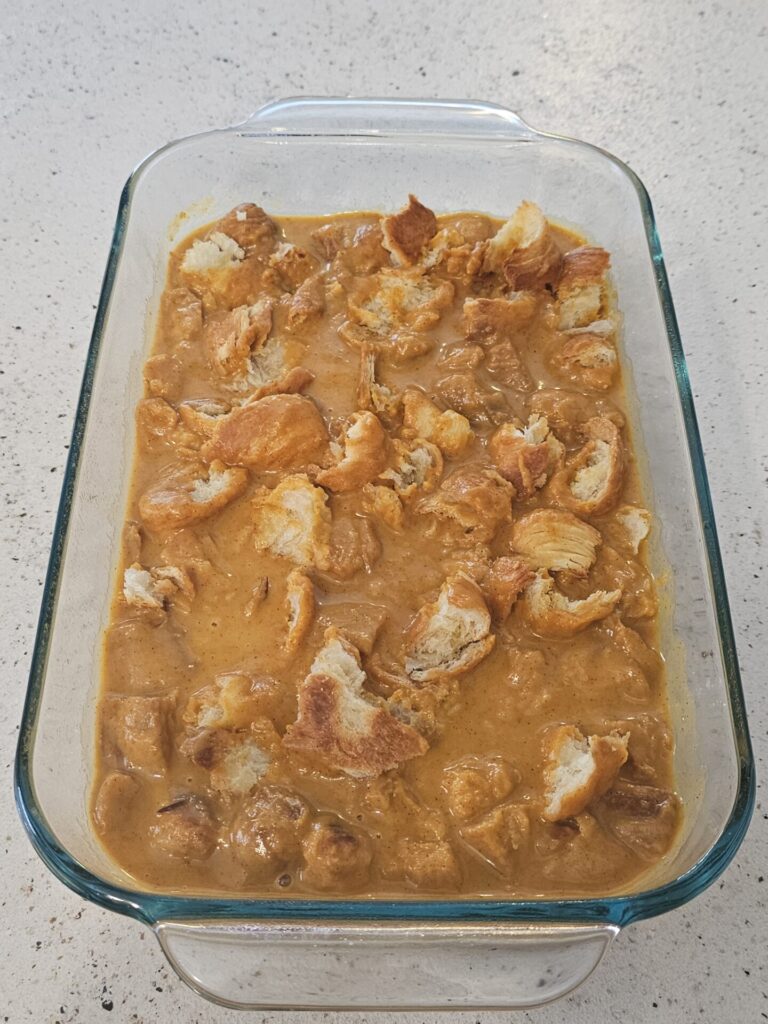 - Pour the pumpkin mixture over the toasted croissant cubes and allow to soak for 30 minutes.