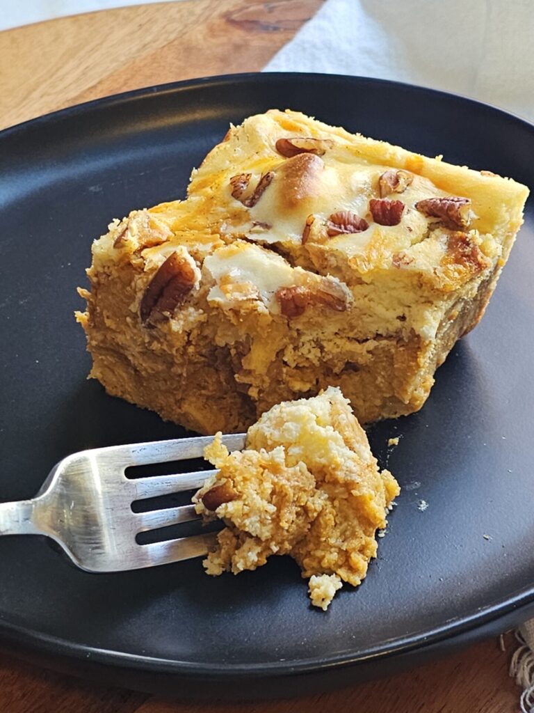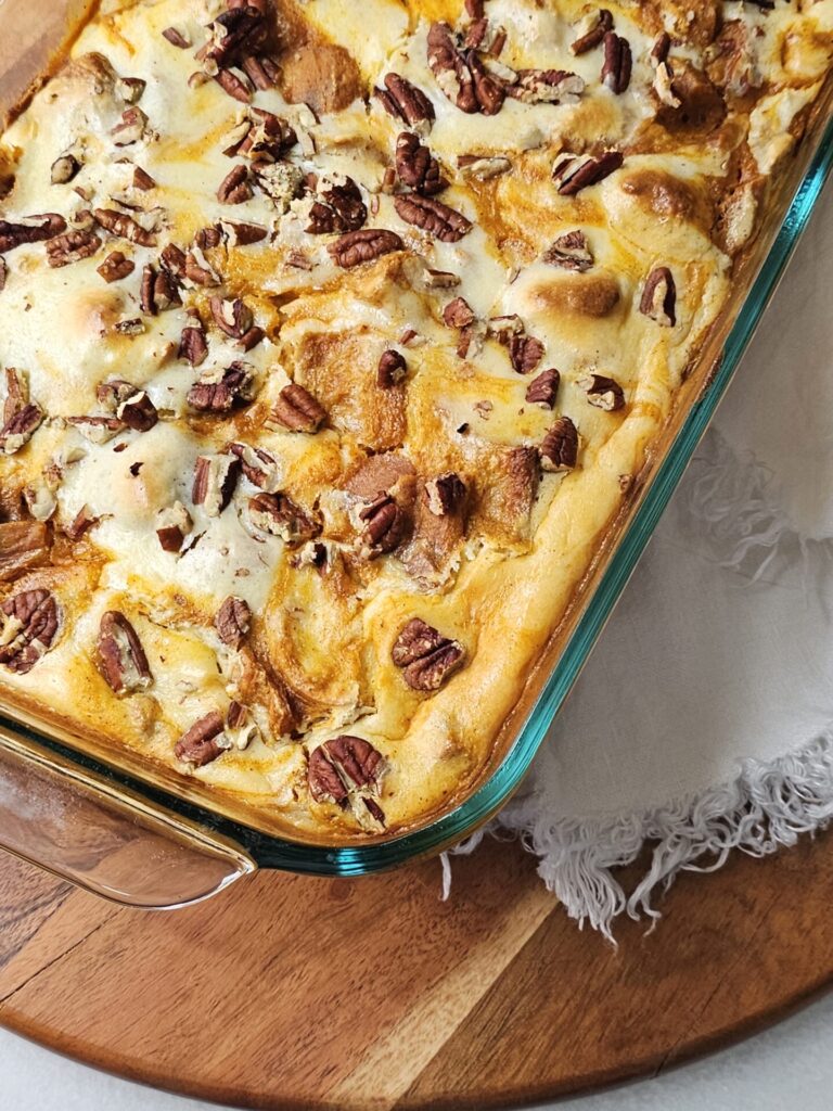 If you’re looking for a dessert that is sure to please both team pumpkin pie and team cheesecake at your next holiday or fall gathering, give this bread pudding recipe a try. I promise it won’t disappoint.