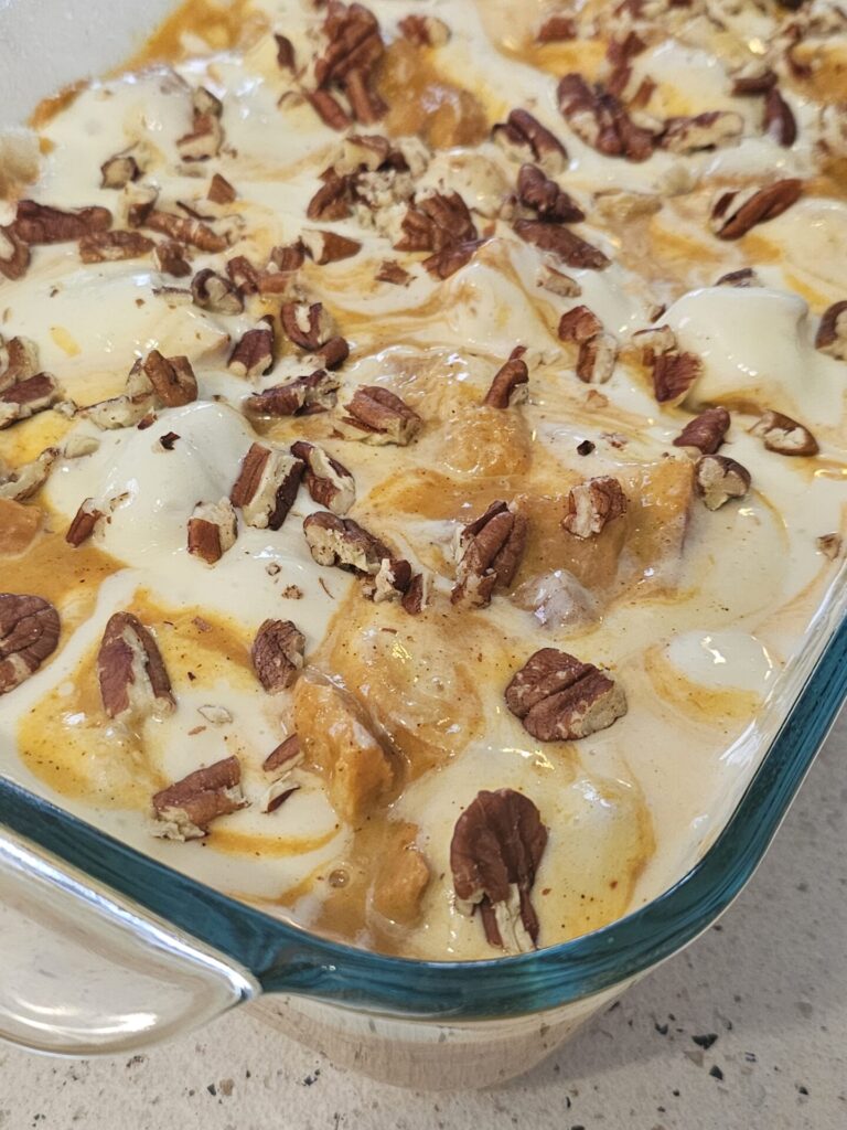This Easy as 1-2-3 Pumpkin Cheesecake Bread Pudding combines the nostalgic charm of pumpkin pie and the decadent richness of cheesecake in one simple dessert. Toasted croissant cubes are suspended in a pumpkin custard, with delightful pockets of cheesecake batter swirled throughout. Pecans are sprinkled on top for a little added crunch.