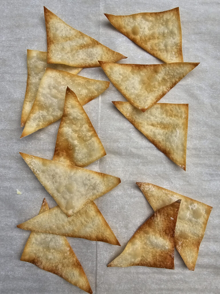 What’s a dip without some dippables? I got you covered with homemade baked wonton chips. These crispy golden triangles are a snap to make and the perfect companion to this irresistible dip. Store-bought, packaged wonton or egg roll wrappers are cut into triangles and lightly brushed with peanut oil on one side. If you’d like to make these chips nut-free and lighter, you can instead lightly coat them with a non-stick cooking spray such as Pam. However, I like the added flavor that the peanut oil lends to these chips.