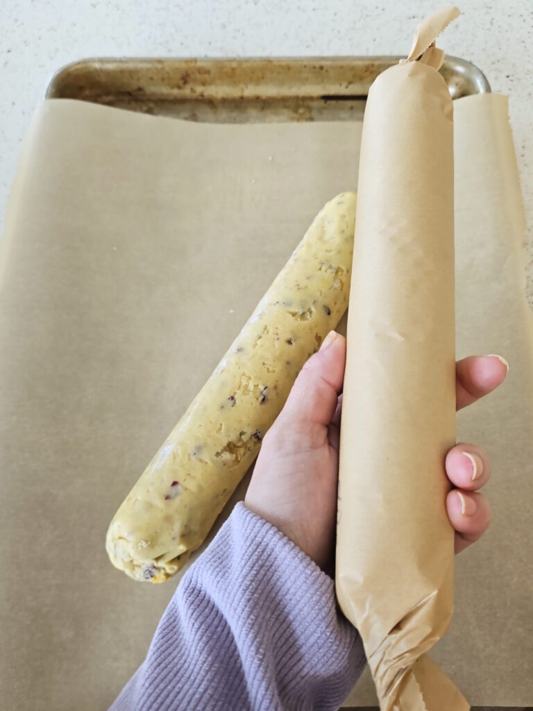 - Divide the dough into two equal portions. Using a little flour to keep you hands from sticking, gently shape the dough into a log in the center of each parchment sheet. Roll the dough up into a cylinder and twist the ends of the paper to create a tight roll. Chill the dough logs for a minimum of 2 hours before baking – overnight is best, though.
